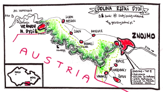 Park Narodowy Rzeki Dyji to najmniejszy czeski Park Narodowy. Chroni unikatowe w skali Europy miejsce, gdzie rzeka wcina się imponującym, zalesionym kanionem w wapienne, bardzo stare skały pogórza Moraw. To jednocześnie granica czesko-austriacka, bo stronie sąsiadów Park nowi nazwę Thayatal. Okolica parku (otulina) to zazwyczaj mocno nasłonecznione pagórki – około 400 metrowe, więc to idealne tereny winiarskie, okoliczne wioski (z których można wrócić autobusem do Znojma) słyną z białych win i piwniczek winiarskich. Wyszliśmy szlakiem z parku do kilku takich wiosek – Havranice, Hnanice, Satov. Ale najsłynniejsza okoliczna winnica, Sobes, akurat leży w kanionie na jednym z meandrów rzeki, blisko strategicznej przeprawy przez rzekę i młyna wodnego.