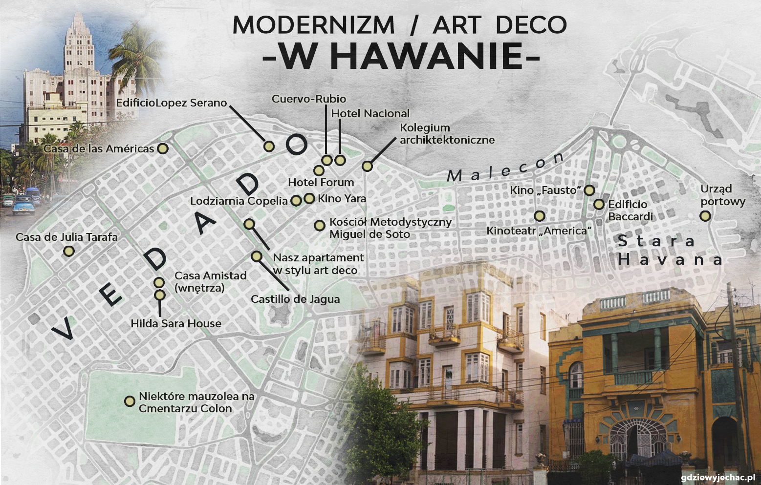 Łatwo wyrobić sobie fałszywe zdanie o Hawanie, krążąc jedynie w jej starej, kolonialnej części lub wzdłuż Malecon. A wystarczy przyspieszyć kroku, by w pół godziny wzdłuż betonowego nabrzeża dotrzeć do dystryktu Vedado. Miejsca, obok którego żaden miłośnik dobrej architektury XX-wiecznej, nie przejdzie obojętnie. Co więcej, jednego z ciekawszych tego typu miejsc na świecie. Choć żeby prawidłowo odczytać ducha tego miejsca, należy cofnąć się w czasie prawie 100 lat, gdy Kuba była jednym z bogatszych krajów Ameryki Łacińskiej a Hawana obok Nowego Jorku i Miami ulubionym miastem amerykańskiej i latynoskiej śmietanki towarzyskiej.