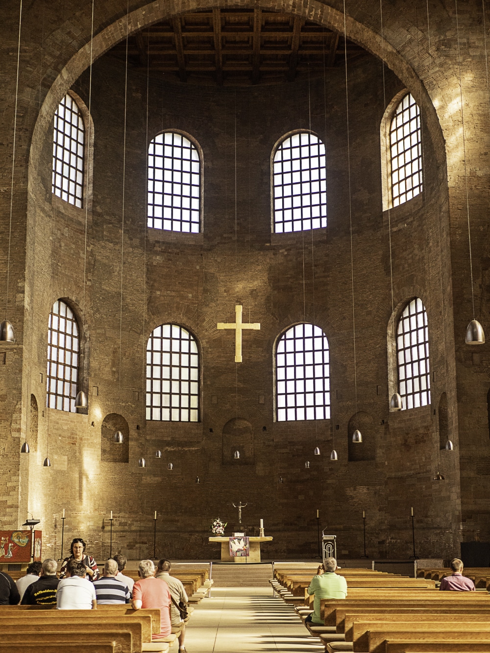 Przepiękna, monumentalna budowla, która zachwyca zarówno z zewnątrz, jak i w środku – mimo, a może właśnie ze względu na swoją surowość – choć takiej tu nie było za czasów rzymskich, wręcz przeciwnie. Choć sprawia wrażenie, jakby była w całości ceglana, wiemy dziś, że zdobiły ją bogate marmury i liczne rzeźby. Obecnie znajduje się tu kościół ewangelicki i jest częścią pałacu elektorów, otoczonego ukwieconym, barokowym ogrodem. Bujnym i kolorowym nawet jesienią. Zbudowana została w IV wieku i stanowiła salę tronową cesarza Konstantyna.