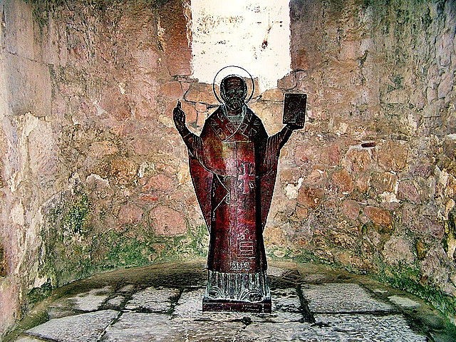 w bliskim sąsiedztwie ruin antycznej Myry. To niezwykle ważne miasto antycznego świata (należało do Związku Licyjskiego) słynie właściwie z dwóch atrakcji – pierwsza to grobowce skalne pochodzące z V i IV w p.n.e, ruiny rzymskiego teatru i inne popularnych wśród turystów pozostałości po bardzo odległych czasach, druga – jest nieco zaskakująca, bo wiąże się ze świętym Mikołajem. Tak! to nie pomyłka, ten kojarzący się nam ze śniegiem, świętami Bożego Narodzenia, saniami zaprzężonymi w renifery ubrany w czerwony strój starszy brodaty pan przez wiele lat mieszkał w tym tureckim mieście. W czasach bizantyjskich znany na całym świecie święty pełnił tu urząd biskupa. Dziś po świętym Mikołaju, który jak głoszą legendy zawsze był szczodry wobec najbiedniejszych i najbardziej cierpiących, pozostała bazylika pod jego wezwaniem. Aż do XI wieku w kościele znajdował się również grobowiec ze szczątkami sławnego biskupa, jednak zostały one skradzione przez włoskich kupców i przewiezione do Bari. Na uwagę zasługuje również posąg świętego, który przedstawiony został razem z dziećmi. Gdyby nie to, że przedstawiona postać jest nieco wyższa, szczuplejsza, no i ma „trochę’ inny strój  niż „komercyjny” święty Mikołaj, to można by nawet uznać, że jest podobny do rozpowszechnionego na całym świecie wizerunku świętego – starszy, uśmiechnięty pan z brodą, do którego garną się dzieci. Rzeźba może i jest podobna, ale gdzie jest śnieg, wielkie sanie i renifery?